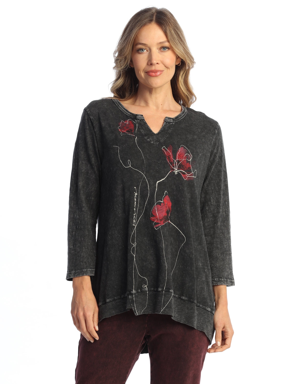 / Black Mineral Washed 100% Cotton Slub Slit V-Neck Tunic Top