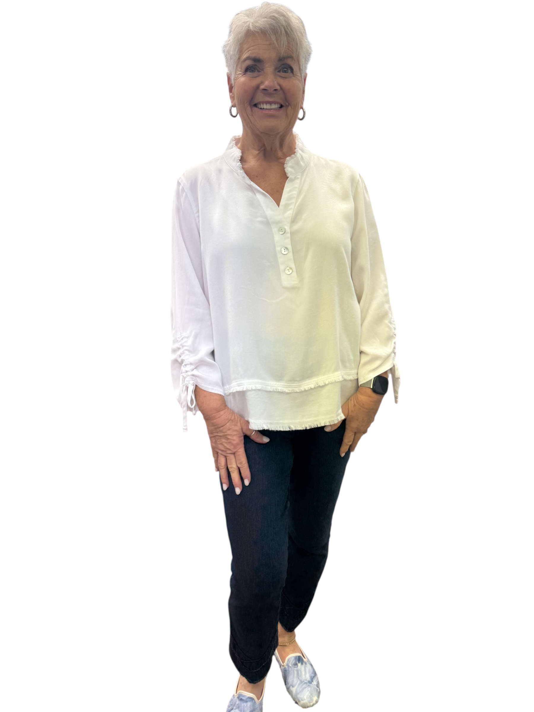 / Drawstring 3/4 Sleeve Band Collar Double Fringe Hem