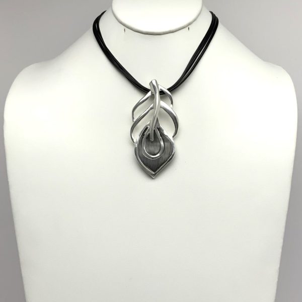 / Short Three Strand Vinyl Cord Necklace with Metal Leaf Pendant
